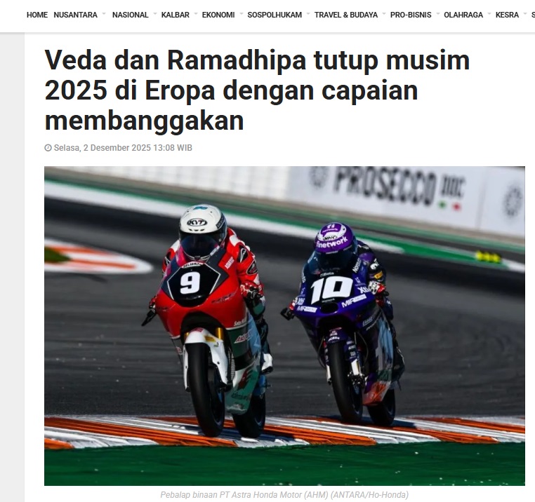 Veda dan Ramadhipa tutup musim 2025 di Eropa dengan capaian membanggakan by Dedi 2 Desember 2025 in Silahkan kunjungi https://kalbar.antaranews.com/berita/676149/veda-dan-ramadhipa-tutup-musim-2025-di-eropa-dengan-capaian-membanggakan. You Might Like Regional Public Launching New ADV160 The SUV Pride Grand Launching New PCX 160 Truly Exceptional! Tetap hati-hati ya bro sist berkendara saat hujan.