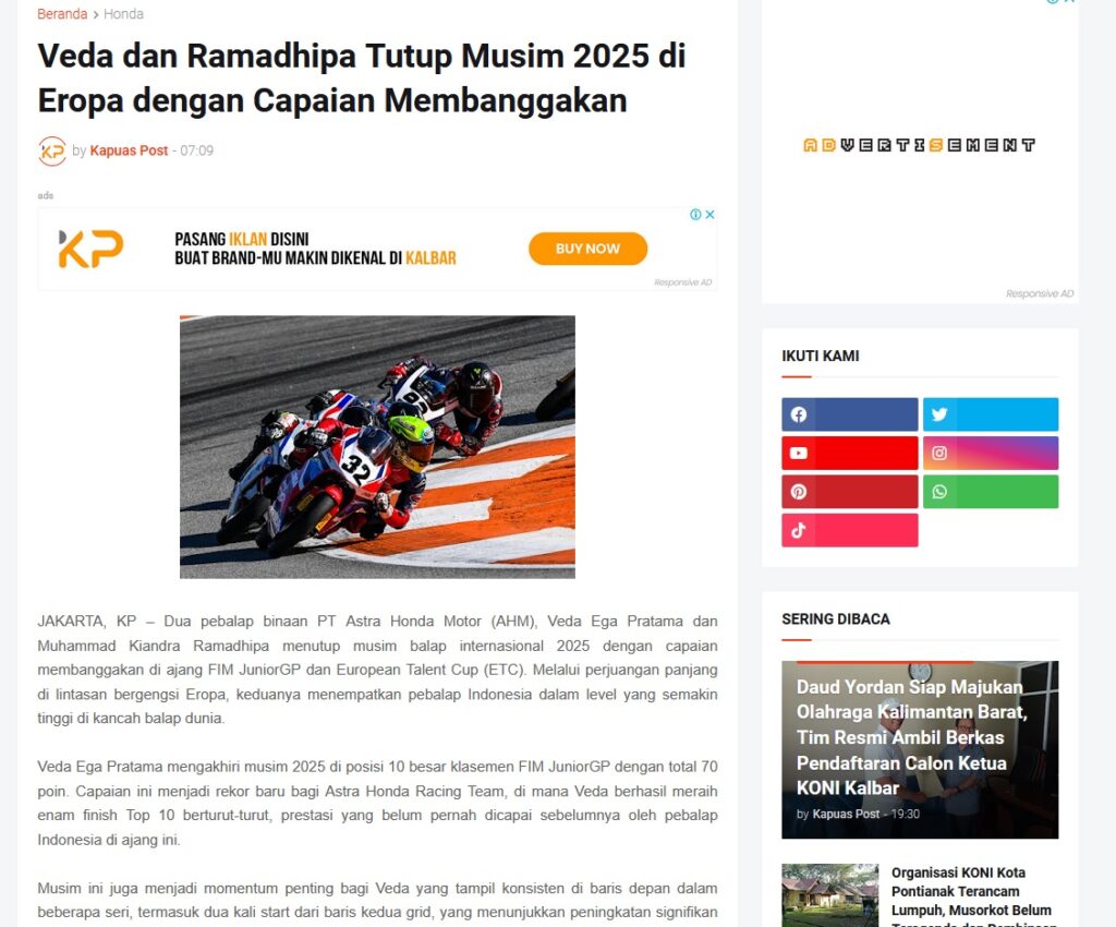 Veda dan Ramadhipa Tutup Musim 2025 di Eropa dengan Capaian Membanggakan by Muhammad Arif 1 Desember 2025 in Silahkan kunjungi https://www.kapuaspost.web.id/2025/12/veda-dan-ramadhipa-tutup-musim-2025-di.html. Tags: astra Astra Motor kalbar Astra Motor Pontianak astramotor honda kalbar pontianak sepeda motor You Might Like Regional Public Launching New ADV160 The SUV Pride Grand Launching New PCX 160 Truly Exceptional! Tetap hati-hati ya bro sist berkendara saat hujan.