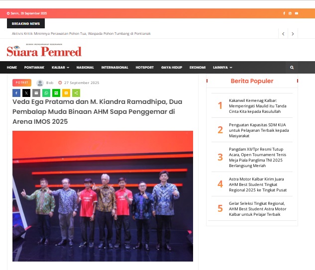 Veda Ega Pratama dan M. Kiandra Ramadhipa, Dua Pembalap Muda Binaan AHM Sapa Penggemar di Arena IMOS 2025 by masmul 27 September 2025 in Silahkan kunjungi https://www.suarapemredkalbar.com/read/potret/27092025/veda-ega-pratama-dan-m-kiandra-ramadhipa-dua-pembalap-muda-binaan-ahm-sapa-penggemar-di-arena-imos-2025. You Might Like Regional Public Launching New ADV160 The SUV Pride Grand Launching New PCX 160 Truly Exceptional! Tetap hati-hati ya bro sist berkendara saat hujan.