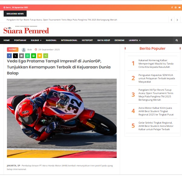 Veda Ega Pratama Tampil Impresif di JuniorGP, Tunjukkan Kemampuan Terbaik di Kejuaraan Dunia Balap by masmul 29 September 2025 in Silahkan kunjungi https://www.suarapemredkalbar.com/read/potret/29092025/veda-ega-pratama-tampil-impresif-di-juniorgp-tunjukkan-kemampuan-terbaik-di-kejuaraan-dunia-balap. You Might Like Regional Public Launching New ADV160 The SUV Pride Grand Launching New PCX 160 Truly Exceptional! Tetap hati-hati ya bro sist berkendara saat hujan.