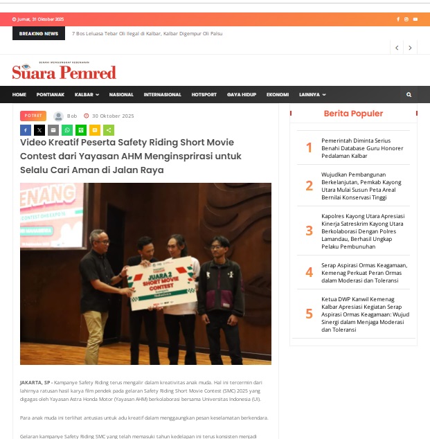 Video Kreatif Peserta Safety Riding Short Movie Contest dari Yayasan AHM Menginsprirasi untuk Selalu Cari Aman di Jalan Raya by masmul 30 Oktober 2025 in Silahkan kunjungi https://www.suarapemredkalbar.com/read/potret/30102025/video-kreatif-peserta-safety-riding-short-movie-contest-dari-yayasan-ahmmenginsprirasi-untuk-selalu-cari-aman-di-jalan-raya. You Might Like Regional Public Launching New ADV160 The SUV Pride Grand Launching New PCX 160 Truly Exceptional! Tetap hati-hati ya bro sist berkendara saat hujan.