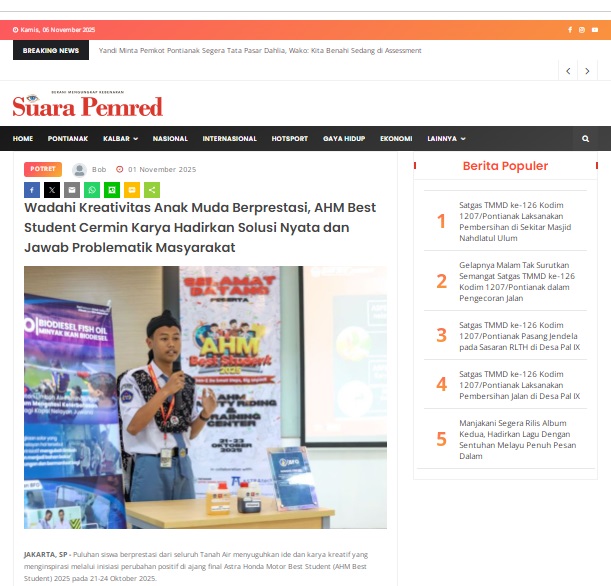 Wadahi Kreativitas Anak Muda Berprestasi, AHM Best Student Cermin Karya Hadirkan Solusi Nyata dan Jawab Problematik Masyarakat by masmul 1 November 2025 in Silahkan kunjungi https://www.suarapemredkalbar.com/read/potret/01112025/wadahi-kreativitas-anak-muda-berprestasi-ahm-best-student-cermin-karya-hadirkan-solusi-nyata-dan-jawab-problematik-masyarakat. You Might Like Regional Public Launching New ADV160 The SUV Pride Grand Launching New PCX 160 Truly Exceptional! Tetap hati-hati ya bro sist berkendara saat hujan.