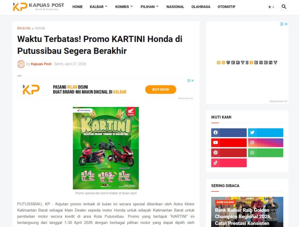 Waktu Terbatas! Promo KARTINI Honda di Putussibau Segera Berakhir by Muhammad Arif 27 April 2026 in Silahkan kunjungi https://www.kapuaspost.web.id/2026/04/waktu-terbatas-promo-kartini-honda-di.html. Tags: astra Astra Motor kalbar Astra Motor Pontianak astramotor honda kalbar pontianak sepeda motor You Might Like Regional Public Launching New ADV160 The SUV Pride Grand Launching New PCX 160 Truly Exceptional! Tetap hati-hati ya bro sist berkendara saat hujan.