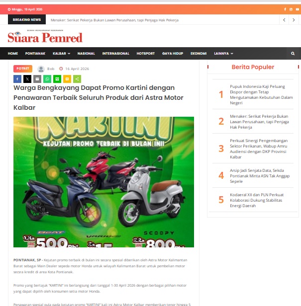 Warga Bengkayang Dapat Promo Kartini dengan Penawaran Terbaik Seluruh Produk dari Astra Motor Kalbar by masmul 16 April 2026 in Silahkan kunjungi https://www.suarapemredkalbar.com/read/potret/16042026/warga-bengkayang-dapat-promo-kartini-dengan-penawaran-terbaik-seluruh-produk-dari-astra-motor-kalbar. You Might Like Regional Public Launching New ADV160 The SUV Pride Grand Launching New PCX 160 Truly Exceptional! Tetap hati-hati ya bro sist berkendara saat hujan.