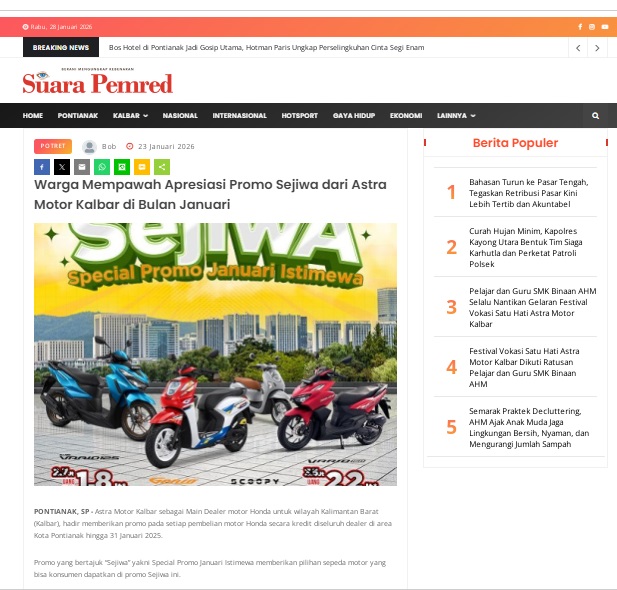 Warga Mempawah Apresiasi Promo Sejiwa dari Astra Motor Kalbar di Bulan Januari by masmul 23 Januari 2026 in Silahkan kunjungi https://www.suarapemredkalbar.com/read/potret/23012026/warga-mempawah-apresiasi-promo-sejiwa-dari-astra-motor-kalbar-di-bulan-januari. You Might Like Regional Public Launching New ADV160 The SUV Pride Grand Launching New PCX 160 Truly Exceptional! Tetap hati-hati ya bro sist berkendara saat hujan.