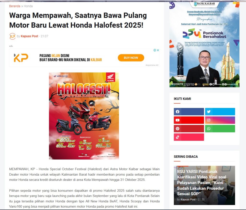 Warga Mempawah, Saatnya Bawa Pulang Motor Baru Lewat Honda Halofest 2025! by Muhammad Arif 23 Oktober 2025 in Silahkan kunjungi https://www.kapuaspost.web.id/2025/10/warga-mempawah-saatnya-bawa-pulang.html. Tags: astra Astra Motor kalbar Astra Motor Pontianak astramotor honda kalbar pontianak sepeda motor You Might Like Regional Public Launching New ADV160 The SUV Pride Grand Launching New PCX 160 Truly Exceptional! Tetap hati-hati ya bro sist berkendara saat hujan.