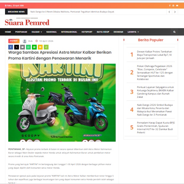 Warga Sambas Apresiasi Astra Motor Kalbar Berikan Promo Kartini dengan Penawaran Menarik by masmul 18 April 2026 in Silahkan kunjungi https://www.suarapemredkalbar.com/read/potret/18042026/warga-sambas-apresiasi-astra-motor-kalbar-berikan-promo-kartini-dengan-penawaran-menarik. You Might Like Regional Public Launching New ADV160 The SUV Pride Grand Launching New PCX 160 Truly Exceptional! Tetap hati-hati ya bro sist berkendara saat hujan.