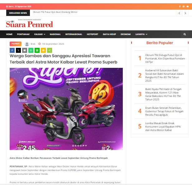 Warga Sambas dan Sanggau Apresiasi Tawaran Terbaik dari Astra Motor Kalbar Lewat Promo Superb by masmul 18 September 2025 in Silahkan kunjungi https://www.suarapemredkalbar.com/read/potret/18092025/warga-sambas-dan-sanggau-apresiasi-tawaran-terbaik-dari-astra-motor-kalbar-lewat-promo-superb. You Might Like Regional Public Launching New ADV160 The SUV Pride Grand Launching New PCX 160 Truly Exceptional! Tetap hati-hati ya bro sist berkendara saat hujan.