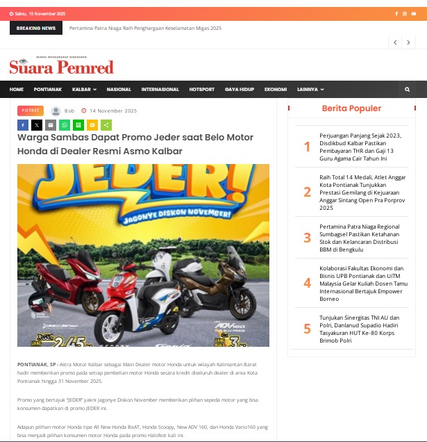 Warga Sambas Dapat Promo Jeder saat Belo Motor Honda di Dealer Resmi Asmo Kalbar by masmul 14 November 2025 in Silahkan kunjungi https://www.suarapemredkalbar.com/read/potret/14112025/warga-sambas-dapat-promo-jeder-saat-belo-motor-honda-di-dealer-resmi-asmo-kalbar. You Might Like Regional Public Launching New ADV160 The SUV Pride Grand Launching New PCX 160 Truly Exceptional! Tetap hati-hati ya bro sist berkendara saat hujan.