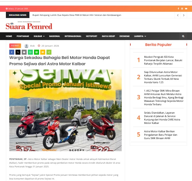 Warga Sekadau Bahagia Beli Motor Honda Dapat Promo Sejiwa dari Astra Motor Kalbar by masmul 20 Januari 2026 in Silahkan kunjungi https://www.suarapemredkalbar.com/read/potret/20012026/warga-sekadau-bahagia-beli-motor-honda-dapat-promo-sejiwa-dari-astra-motor-kalbar. You Might Like Regional Public Launching New ADV160 The SUV Pride Grand Launching New PCX 160 Truly Exceptional! Tetap hati-hati ya bro sist berkendara saat hujan.
