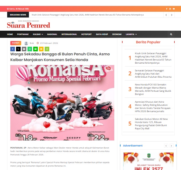 Warga Sekadau Bangga di Bulan Penuh Cinta, Asmo Kalbar Manjakan Konsumen Setia Honda by masmul 23 Februari 2026 in Silahkan kunjungi https://www.suarapemredkalbar.com/read/potret/23022026/warga-sekadau-bangga-di-bulan-penuh-cinta-asmo-kalbar-manjakan-konsumen-setia-honda. You Might Like Regional Public Launching New ADV160 The SUV Pride Grand Launching New PCX 160 Truly Exceptional! Tetap hati-hati ya bro sist berkendara saat hujan.