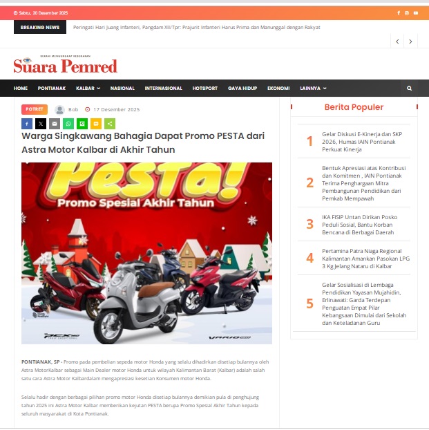 Warga Singkawang Bahagia Dapat Promo PESTA dari Astra Motor Kalbar di Akhir Tahun by masmul 17 Desember 2025 in Silahkan kunjungi https://www.suarapemredkalbar.com/read/potret/17122025/warga-singkawang-bahagia-dapat-promo-pesta-dari-astra-motor-kalbar-di-akhir-tahun. You Might Like Regional Public Launching New ADV160 The SUV Pride Grand Launching New PCX 160 Truly Exceptional! Tetap hati-hati ya bro sist berkendara saat hujan.