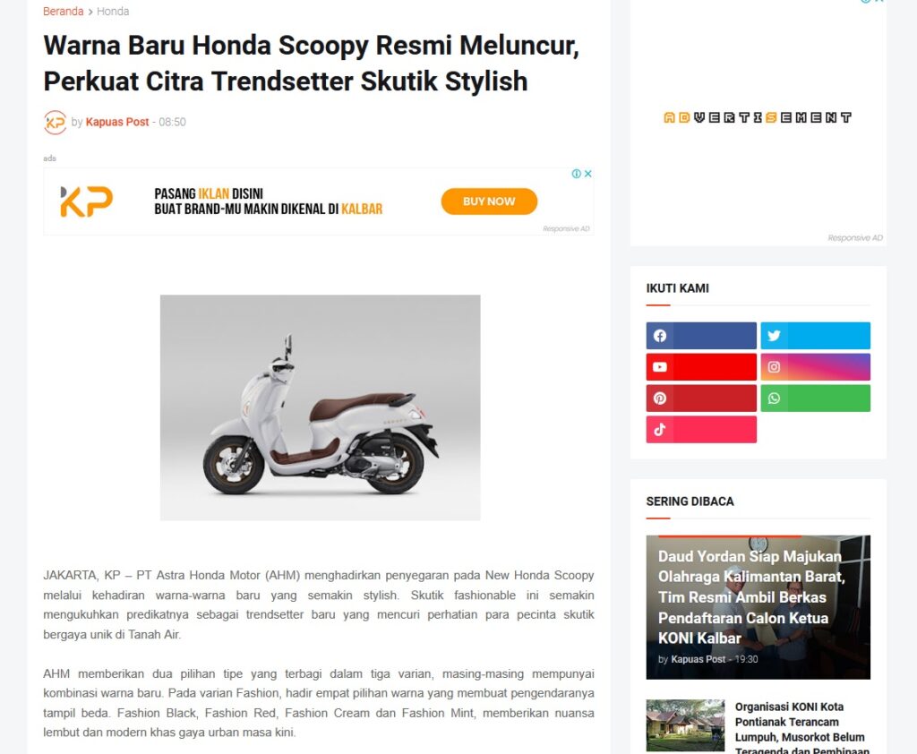 Warna Baru Honda Scoopy Resmi Meluncur, Perkuat Citra Trendsetter Skutik Stylish by Muhammad Arif 29 November 2025 in Silahkan kunjungi https://www.kapuaspost.web.id/2025/11/warna-baru-honda-scoopy-resmi-meluncur.html. Tags: astra Astra Motor kalbar Astra Motor Pontianak astramotor honda kalbar pontianak sepeda motor You Might Like Regional Public Launching New ADV160 The SUV Pride Grand Launching New PCX 160 Truly Exceptional! Tetap hati-hati ya bro sist berkendara saat hujan.