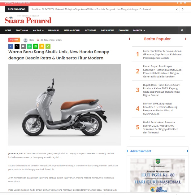 Warna Baru Sang Skutik Unik, New Honda Scoopy dengan Desain Retro & Unik serta Fitur Modern by masmul 28 November 2025 in Silahkan kunjungi https://www.suarapemredkalbar.com/read/potret/28112025/warna-baru-sang-skutik-unik-new-honda-scoopy-dengan-desain-retro-unik-serta-fitur-modern. You Might Like Regional Public Launching New ADV160 The SUV Pride Grand Launching New PCX 160 Truly Exceptional! Tetap hati-hati ya bro sist berkendara saat hujan.