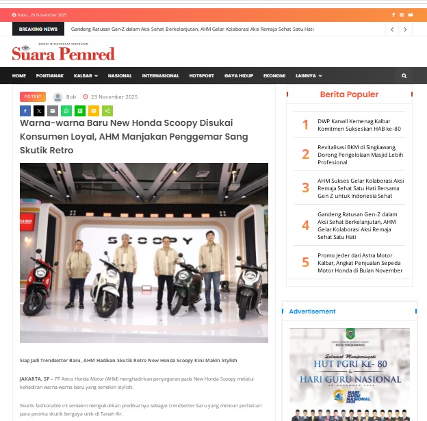 Warna-warna Baru New Honda Scoopy Disukai Konsumen Loyal, AHM Manjakan Penggemar Sang Skutik Retro by masmul 23 November 2025 in Silahkan kunjungi https://www.suarapemredkalbar.com/read/potret/23112025/warna-warna-baru-new-honda-scoopy-disukai-konsumen-loyal-ahm-manjakan-penggemar-sang-skutik-retro. You Might Like Regional Public Launching New ADV160 The SUV Pride Grand Launching New PCX 160 Truly Exceptional! Tetap hati-hati ya bro sist berkendara saat hujan.