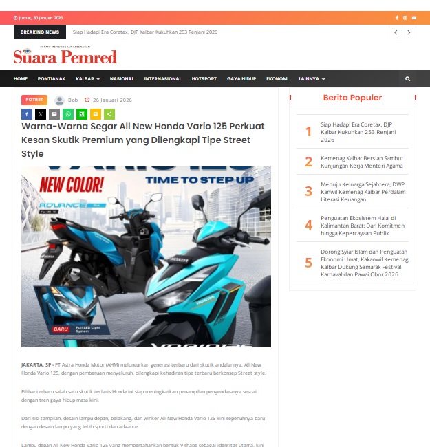 Warna-Warna Segar All New Honda Vario 125 Perkuat Kesan Skutik Premium yang Dilengkapi Tipe Street Style by masmul 26 Januari 2026 in Silahkan kunjungi https://www.suarapemredkalbar.com/read/potret/26012026/warna-warna-segar-all-new-honda-vario-125-perkuat-kesan-skutik-premium-yang-dilengkapi-tipe-street-style. You Might Like Regional Public Launching New ADV160 The SUV Pride Grand Launching New PCX 160 Truly Exceptional! Tetap hati-hati ya bro sist berkendara saat hujan.