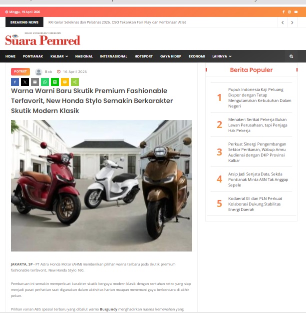 Warna Warni Baru Skutik Premium Fashionable Terfavorit, New Honda Stylo Semakin Berkarakter Skutik Modern Klasik by masmul 16 April 2026 in Silahkan kunjungi https://www.suarapemredkalbar.com/read/potret/16042026/warna-warni-baru-skutik-premium-fashionable-terfavorit-new-honda-stylo-semakin-berkarakter-skutik-modern-klasik. You Might Like Regional Public Launching New ADV160 The SUV Pride Grand Launching New PCX 160 Truly Exceptional! Tetap hati-hati ya bro sist berkendara saat hujan.