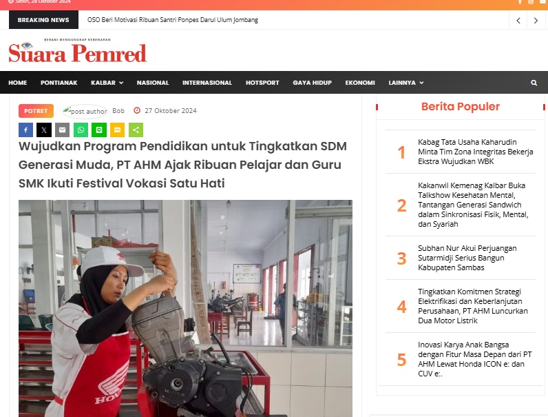 Wujudkan Program Pendidikan untuk Tingkatkan SDM Generasi Muda, PT AHM Ajak Ribuan Pelajar dan Guru SMK Ikuti Festival Vokasi Satu Hati by masmul 27 Oktober 2024 in Silahkan kunjungi https://www.suarapemredkalbar.com/read/potret/27102024/wujudkan-program-pendidikan-untuk-tingkatkan-sdm-generasi-muda-pt-ahm-ajak-ribuan-pelajar-dan-guru-smk-ikuti-festival-vokasi-satu-hati. You Might Like Regional Public Launching New ADV160 The SUV Pride Grand Launching New PCX 160 Truly Exceptional! Tetap hati-hati ya bro sist berkendara saat hujan.