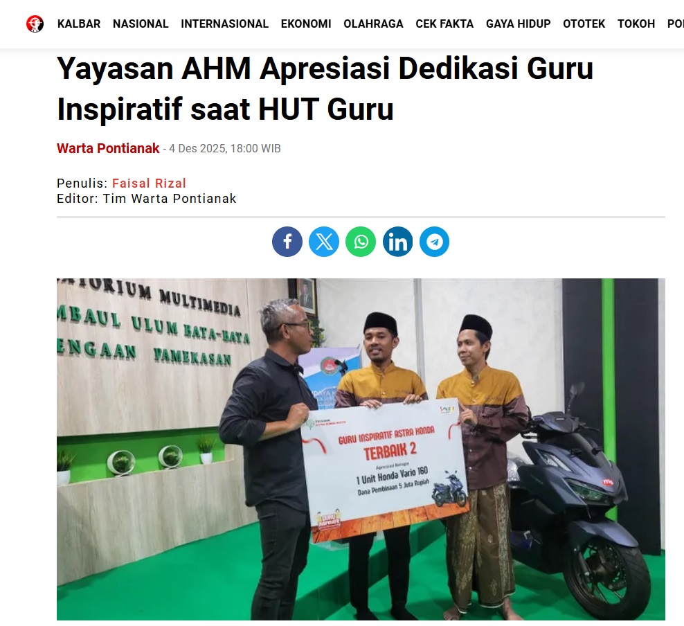 Yayasan AHM Apresiasi Dedikasi Guru Inspiratif saat HUT Guru by Faisal Rizal 4 Desember 2025 in Silahkan kunjungi https://wartapontianak.pikiran-rakyat.com/gaya-hidup/pr-1179839476/yayasan-ahm-apresiasi-dedikasi-guru-inspiratif-saat-hut-guru. You Might Like Regional Public Launching New ADV160 The SUV Pride Grand Launching New PCX 160 Truly Exceptional! Tetap hati-hati ya bro sist berkendara saat hujan.