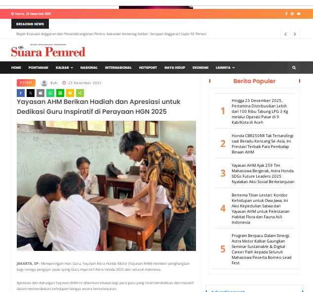 Yayasan AHM Berikan Hadiah dan Apresiasi untuk Dedikasi Guru Inspiratif di Perayaan HGN 2025 by masmul 23 Desember 2025 in Silahkan kunjungi https://www.suarapemredkalbar.com/read/potret/23122025/yayasan-ahm-berikan-hadiah-dan-apresiasi-untuk-dedikasi-guru-inspiratif-di-perayaan-hgn-2025. You Might Like Regional Public Launching New ADV160 The SUV Pride Grand Launching New PCX 160 Truly Exceptional! Tetap hati-hati ya bro sist berkendara saat hujan.