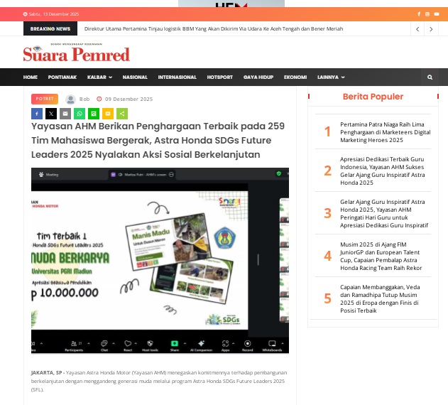 Yayasan AHM Berikan Penghargaan Terbaik pada 259 Tim Mahasiswa Bergerak, Astra Honda SDGs Future Leaders 2025 Nyalakan Aksi Sosial Berkelanjutan by masmul 9 Desember 2025 in Silahkan kunjungi https://www.suarapemredkalbar.com/read/potret/09122025/yayasan-ahm-berikan-penghargaan-terbaik-pada-259-tim-mahasiswa-bergerak-astra-honda-sdgs-future-leaders-2025-nyalakan-aksi-sosial-berkelanjutan. You Might Like Regional Public Launching New ADV160 The SUV Pride Grand Launching New PCX 160 Truly Exceptional! Tetap hati-hati ya bro sist berkendara saat hujan.
