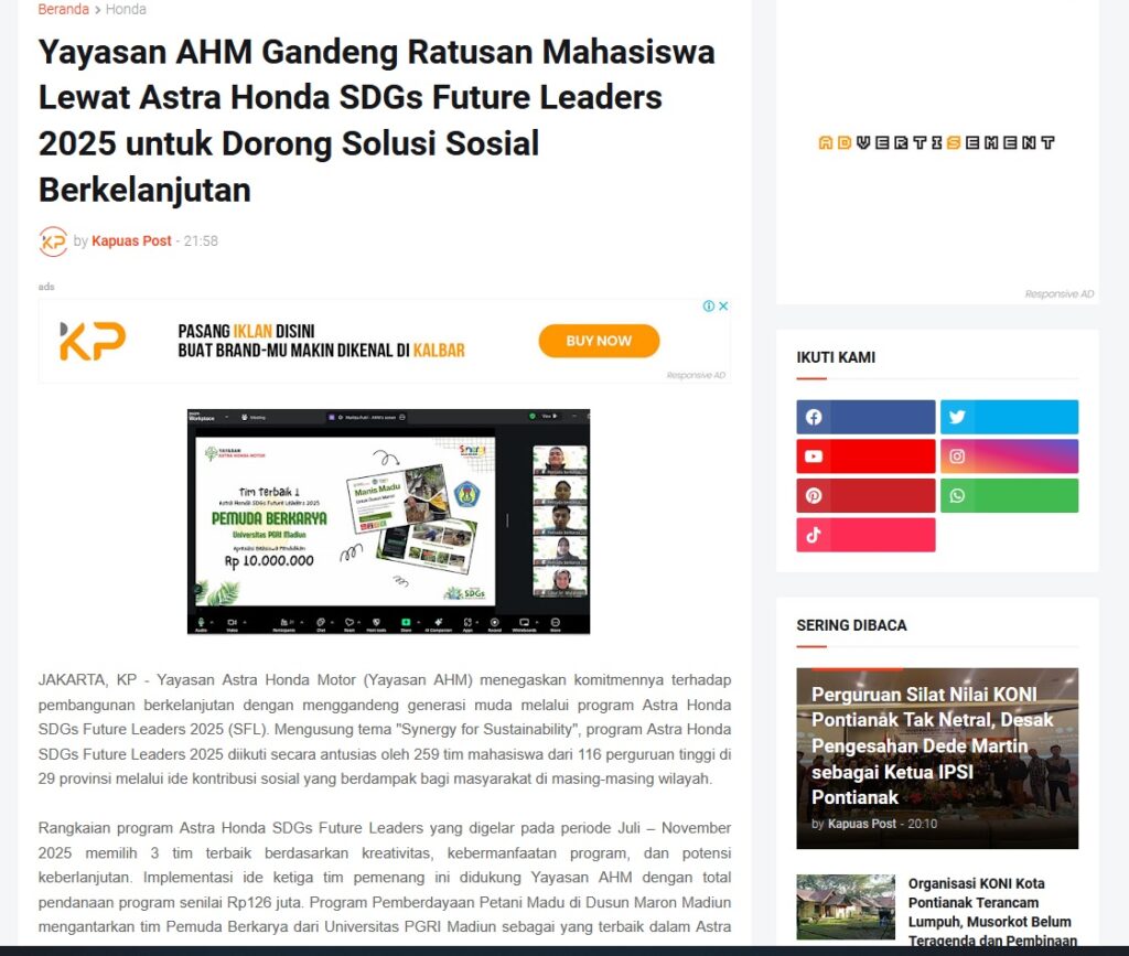 Yayasan AHM Gandeng Ratusan Mahasiswa Lewat Astra Honda SDGs Future Leaders 2025 untuk Dorong Solusi Sosial Berkelanjutan by Muhammad Arif 17 Desember 2025 in Silahkan kunjungi https://www.kapuaspost.web.id/2025/12/yayasan-ahm-gandeng-ratusan-mahasiswa.html. Tags: astra Astra Motor kalbar Astra Motor Pontianak astramotor honda kalbar pontianak sepeda motor You Might Like Regional Public Launching New ADV160 The SUV Pride Grand Launching New PCX 160 Truly Exceptional! Tetap hati-hati ya bro sist berkendara saat hujan.