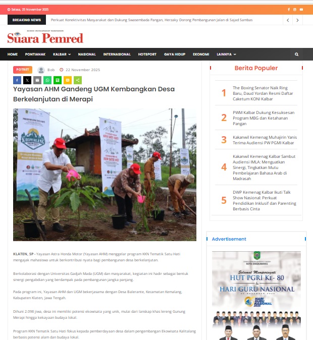 Yayasan AHM Gandeng UGM Kembangkan Desa Berkelanjutan di Merapi by masmul 22 November 2025 in Silahkan kunjungi https://www.suarapemredkalbar.com/read/potret/22112025/yayasan-ahm-gandeng-ugm-kembangkan-desa-berkelanjutan-di-merapi. You Might Like Regional Public Launching New ADV160 The SUV Pride Grand Launching New PCX 160 Truly Exceptional! Tetap hati-hati ya bro sist berkendara saat hujan.