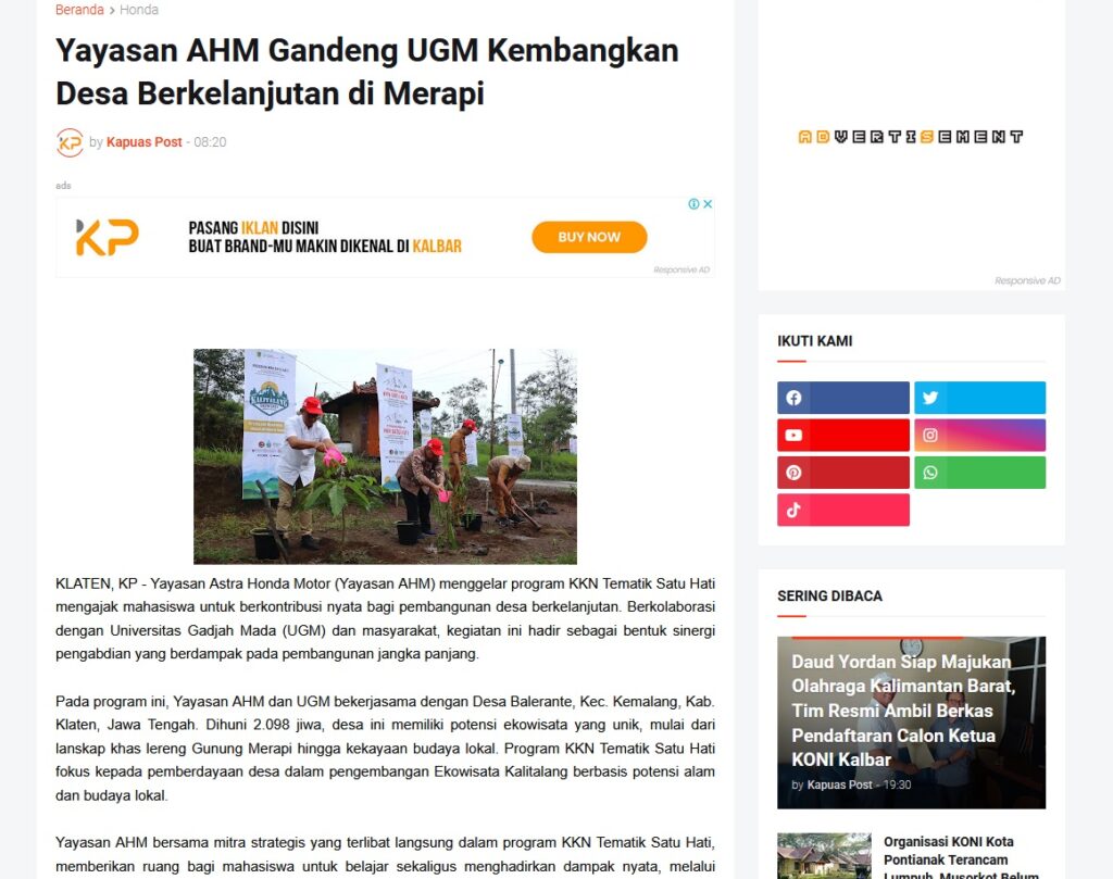Yayasan AHM Gandeng UGM Kembangkan Desa Berkelanjutan di Merapi by Muhammad Arif 22 November 2025 in Silahkan kunjungi https://www.kapuaspost.web.id/2025/11/yayasan-ahm-gandeng-ugm-kembangkan-desa.html. Tags: astra Astra Motor kalbar Astra Motor Pontianak astramotor honda kalbar pontianak sepeda motor You Might Like Regional Public Launching New ADV160 The SUV Pride Grand Launching New PCX 160 Truly Exceptional! Tetap hati-hati ya bro sist berkendara saat hujan.