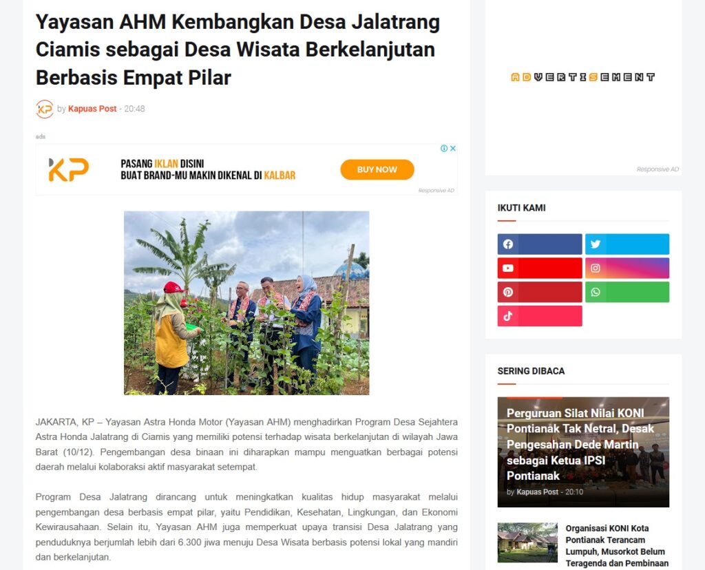Yayasan AHM Kembangkan Desa Jalatrang Ciamis sebagai Desa Wisata Berkelanjutan Berbasis Empat Pilar by Muhammad Arif 18 Desember 2025 in Silahkan kunjungi https://www.kapuaspost.web.id/2025/12/yayasan-ahm-kembangkan-desa-jalatrang.html. Tags: astra Astra Motor kalbar Astra Motor Pontianak astramotor honda kalbar pontianak sepeda motor You Might Like Regional Public Launching New ADV160 The SUV Pride Grand Launching New PCX 160 Truly Exceptional! Tetap hati-hati ya bro sist berkendara saat hujan.