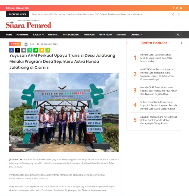 Yayasan AHM Perkuat Upaya Transisi Desa Jalatrang Melalui Program Desa Sejahtera Astra Honda Jalatrang di Ciamis by masmul 2 Januari 2026 in Silahkan kunjungi https://www.suarapemredkalbar.com/read/potret/02012026/yayasan-ahm-perkuat-upaya-transisi-desa-jalatrang-melalui-program-desa-sejahtera-astra-honda-jalatrang-di-ciamis. You Might Like Regional Public Launching New ADV160 The SUV Pride Grand Launching New PCX 160 Truly Exceptional! Tetap hati-hati ya bro sist berkendara saat hujan.