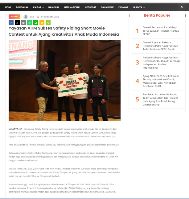 Yayasan AHM Sukses Safety Riding Short Movie Contest untuk Ajang Kreativitas Anak Muda Indonesia by masmul 14 Oktober 2025 in Silahkan kunjungi https://www.suarapemredkalbar.com/read/potret/14102025/yayasan-ahm-sukses-safety-riding-short-movie-contest-untuk-ajang-kreativitas-anak-muda-indonesia. You Might Like Regional Public Launching New ADV160 The SUV Pride Grand Launching New PCX 160 Truly Exceptional! Tetap hati-hati ya bro sist berkendara saat hujan.